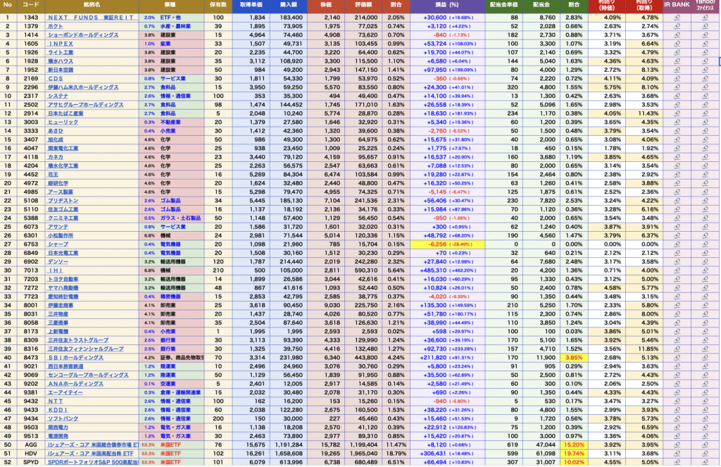 このように、一目瞭然です。今保有している銘柄数やセクタ割合、月々の配当金の金額まで算出してくれます。また、銘柄毎の詳細な情報も自動的に表記されるようになっています。