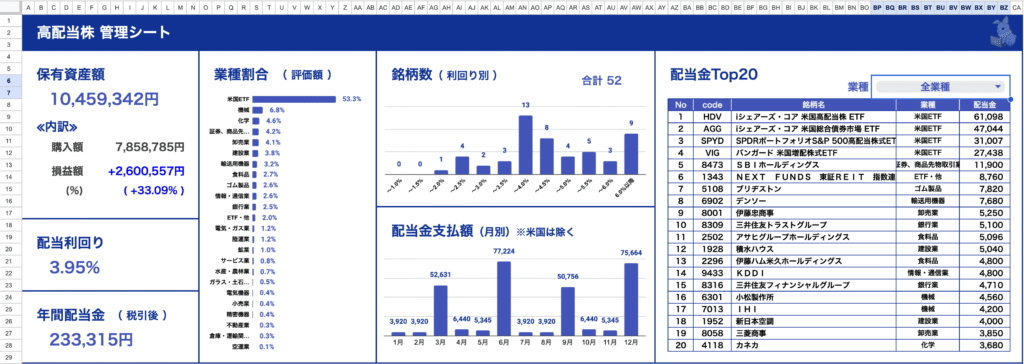 この管理シートは証券会社のデータをダウンロードして貼り付けるだけで、配当利回りや配当金等が全て自動的に算出されます。