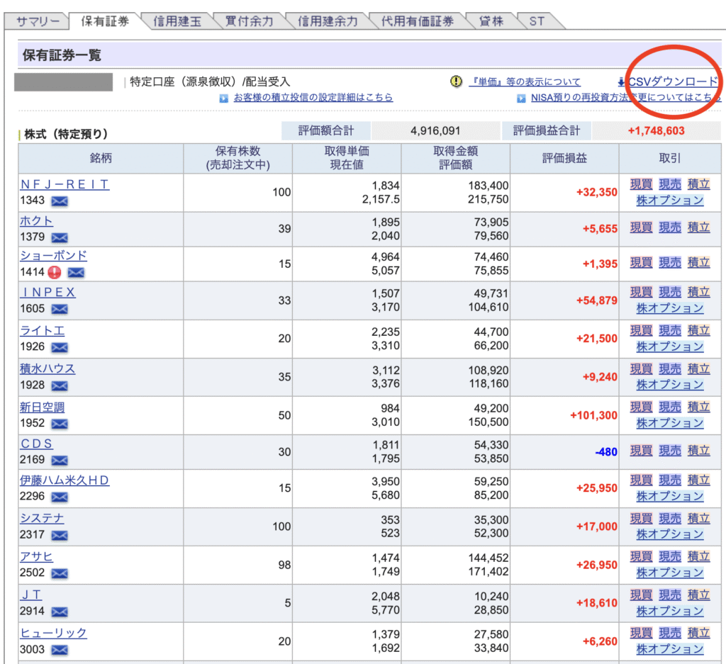 右上(赤マーク)の「CSV出力」を選択するとデータがダウンロードされます。このダウンロードされたファイルを開いて、指定された範囲をコピーして「高配当株管理シート」に貼り付けを行うのみです。