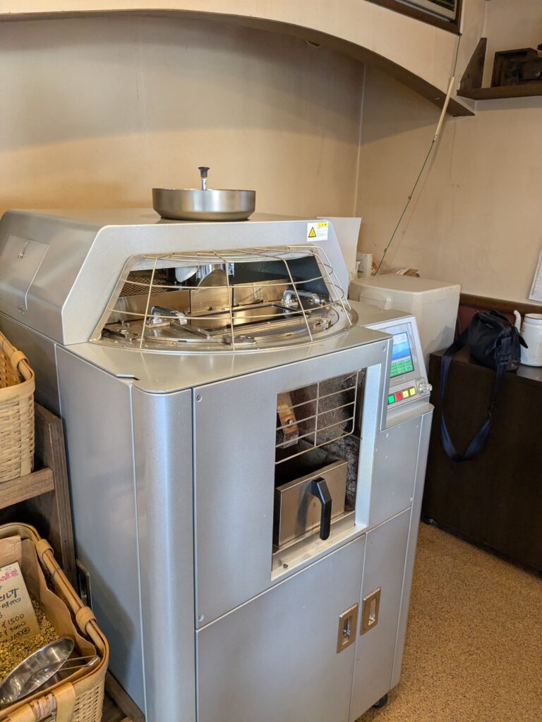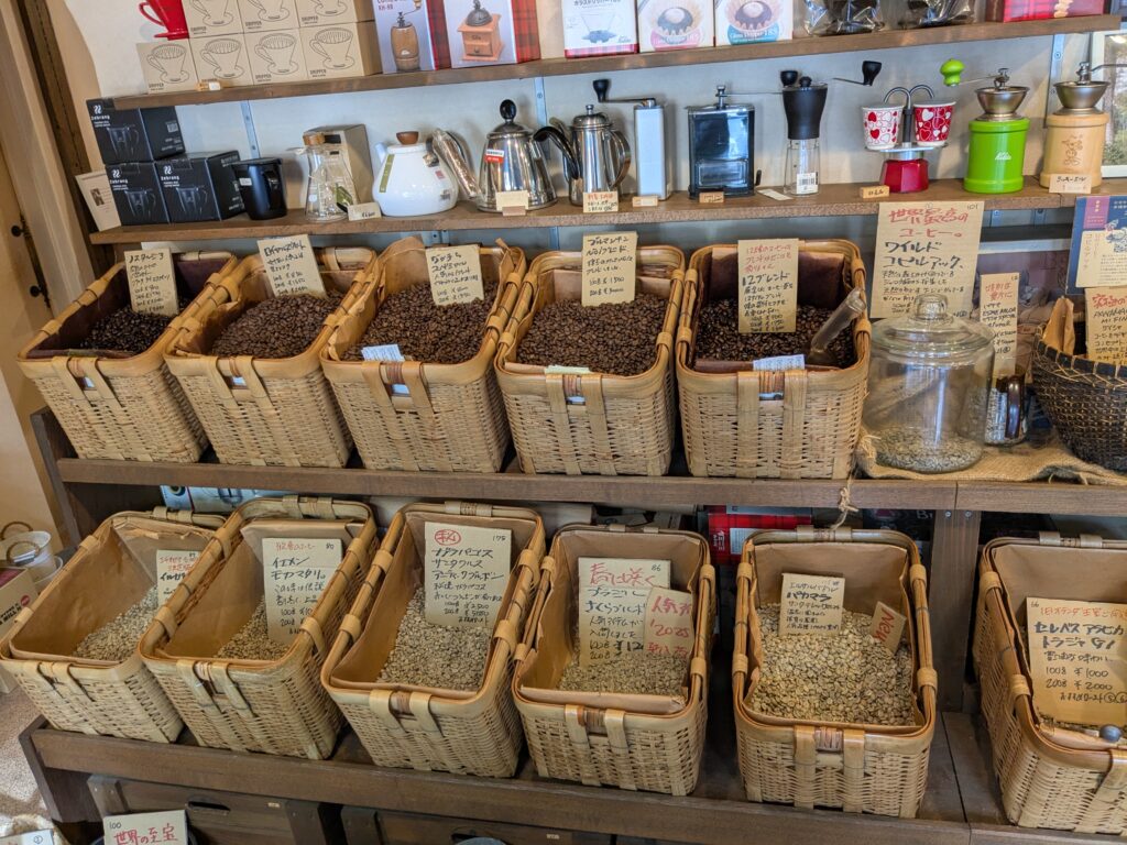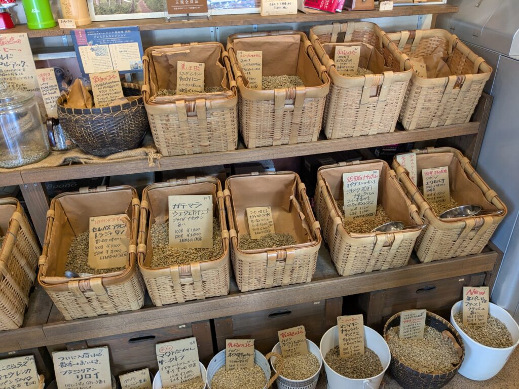 「生豆」のままの状態のコーヒー豆が多く、常連の方は、お店で店長に好みに合わせて焙煎してもらっているのだと思います。ちなみに大きな焙煎機も店内にありました。