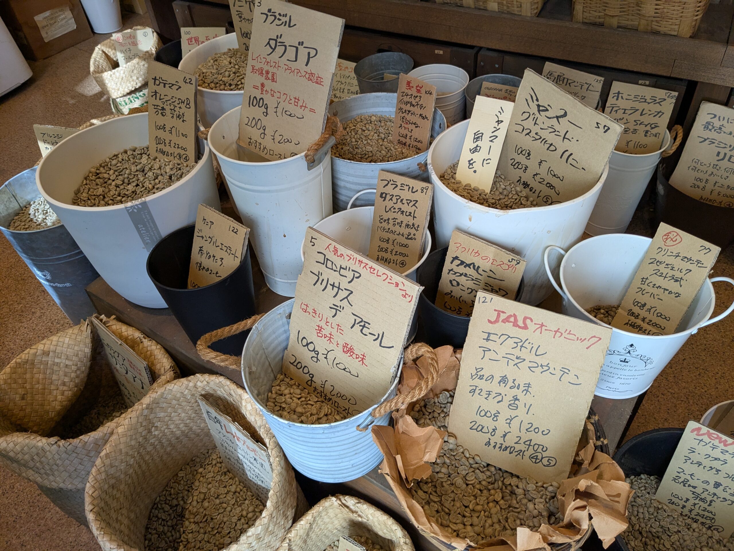 「生豆」のままの状態のコーヒー豆が多く、常連の方は、お店で店長に好みに合わせて焙煎してもらっているのだと思います。ちなみに大きな焙煎機も店内にありました。